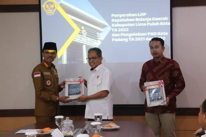 LIMAPULUH KOTA — Kepala perwakilan BPK RI Sumbar, Arif Agus menyerahkan Laporan Hasil Pemeriksaan (LHP) kepatuhan atas belanja daerah Kabupaten Limapuluh Kota tahun 2022 kepada Bupati Limapuluh Kota Safaruddin Dt. Bandaro Rajo dan Ketua DPRD Kabupaten Limapuluh Kota Deni Asra di Ruang Rapat Kepala Perwakilan BPK Sumbar, Senin (16/1/2023).