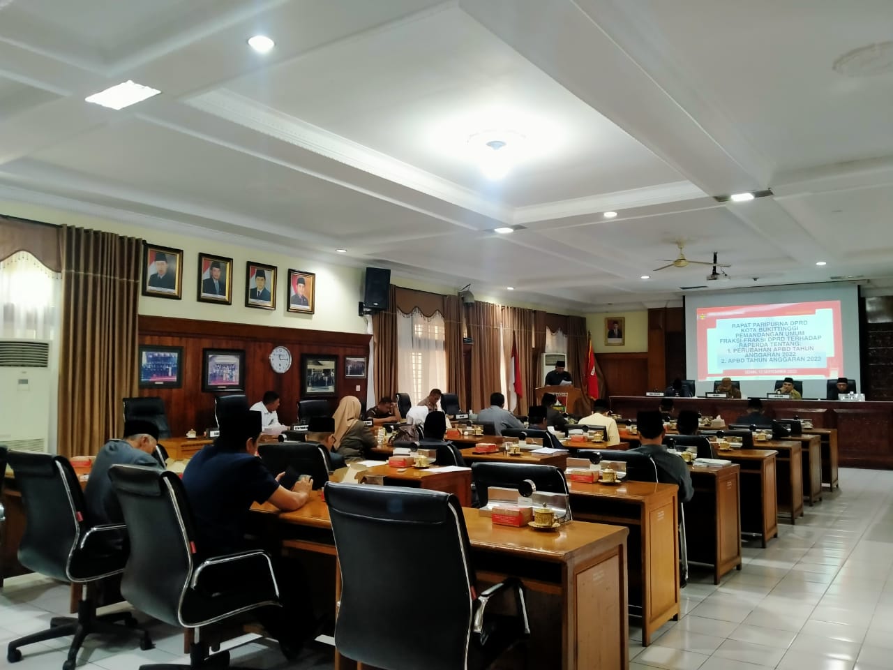 BUKITTINGGI -- Wali Kota Bukittinggi Erman Safar menghadiri rapat paripurna Raperda tentang Perubahan APBD Tahun Anggaran 2022 dan Raperda tentang APBD Tahun Anggaran 2023, Senin (12/9/2022).Rapat paripurna dipimpin langsung Ketua DPRD Bukittinggi Beny Yusrial didampingi dua Wakil Ketua DPRD, mendengarkan pemandangan umum enam fraksi atas hantaran R-APBD Perubahan 2022 dan R-APBD 2023.