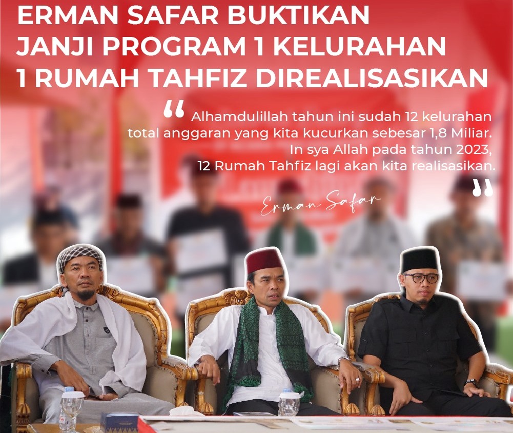 "Program 1 kelurahan 1 rumah tahfiz ini, merupakan salah satu program prioritas, bertujuan membentuk dan menanamkan jiwa cinta Al Quran pada generasi muda. Sehingga mereka memiliki dasar agama yang kuat menghadapi masa depan nanti," kata Wako Erman kepada wartawan di kota itu, Selasa (18/10/2022).Wako jelaskan, bahwa tahun ini sudah 12 kelurahan, total anggaran yang dikucurkan sebesar Rp 1,8 miliar.