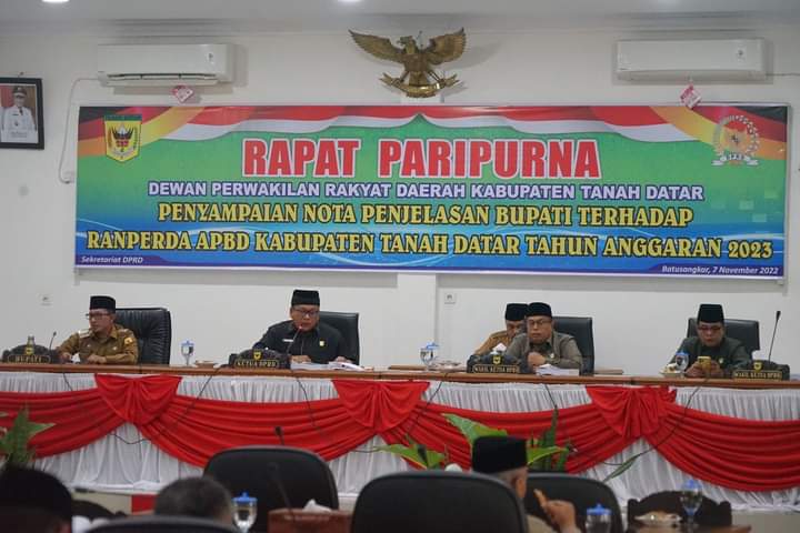 TANAH DATAR - Dewan Perwakilan Rakyat Daerah (DPRD) Tanah Datar menggelar rapat paripurna dengan agenda penyampaian nota penjelasan Bupati Tanah Datar terhadap Ranperda APBD tahun anggaran 2023 di Aula Sidang Dewan, Senin (07/11/2022).Penyampaian Nota Ranperda tersebut untuk perencanaan anggaran 2023 agar dibahas bersama Pemerintah Daerah dengan anggota DPRD yang berisikan gambaran tentang kondisi umum keuangan daerah.