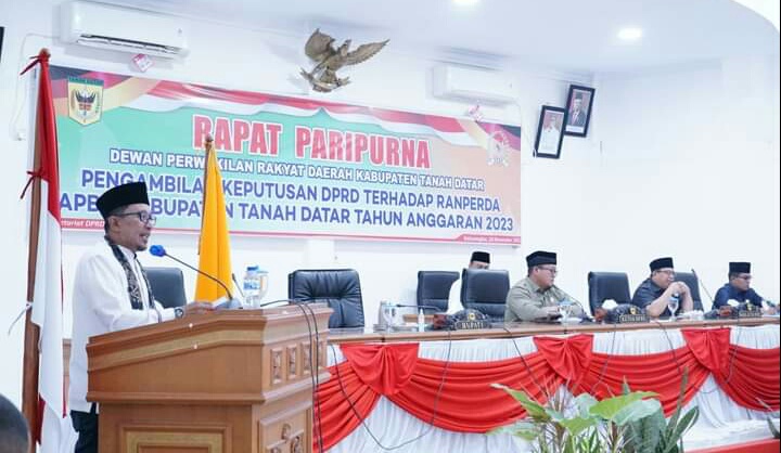 Anton menyampaikan hal itu dalam rapat paripurna DPRD dengan agenda Penandatanganan Persetujuan Bersama terhadap Ranperda APBD 2023 di Aula Dewan setempat, Jumat (18/11/2022).Rapat Paripurna Dewan dipimpin Ketua DPRD Rony Mulyadi didampingi Wakil Ketua Saidani dan Anton Yondra dihadiri 28 anggota serta Sekwan Yuhardi, disaksikan Forkopimda, Asisten, Staf Ahli, Kepala OPD, Camat dan Wali Nagari se-Tanah Datar.
