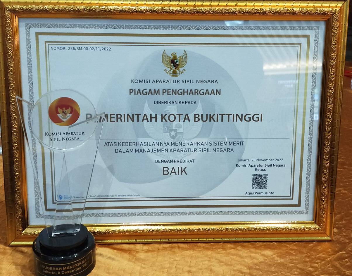 BUKITTINGGI -- Wali Kota Bukittinggi selaku pejabat pembina kepegawaian, kembali terima Anugerah Meritokrasi tahun 2022 kategori baik. Anugerah itu diterima wali kota diwakili Kepala BKPSDM Kota Bukittinggi dari Ketua KASN di Hotel Grand Sahid Jaya, Jakarta, Kamis (8/12/2022).Wali Kota Bukittinggi Erman Safar melalui Kepala BKPSDM Kota Bukittinggi, Sustinna mengucapkan rasa syukur atas anugerah meritokrasi yang diterima tiga kali berturut-turut.