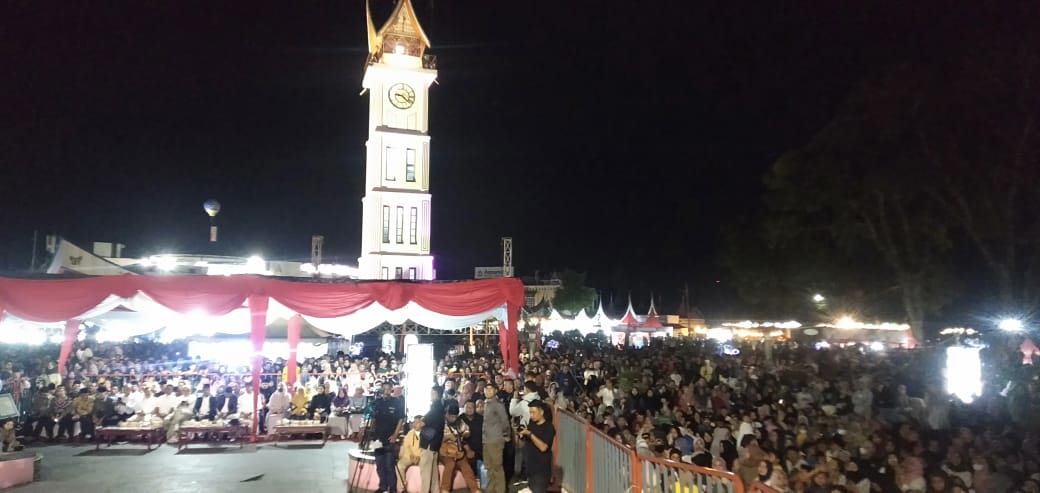BUKITTINGGI -- Ribuan pasang mata menyaksikan konser musik pada Ivent Pesta Budaya Seni Dagang dan Industri (Pedati) ke Xll dan HUT kota Bukittinggi ke- 238, yang digelar di panggung Taman Jam Gadang, Kamis malam (22/12/2202).Pengunjung dari berbagai kalangan usia, ibarat terhipnotis saat menyaksikan penampilan artis Minang papan atas yaitu, Ipank, Ratu Sikumbang dan Ria Amelia. Mereka rela berdesak-desakan untuk bisa dekat ke penggung agar lebih jelas melihat penampilan dari sang artis.