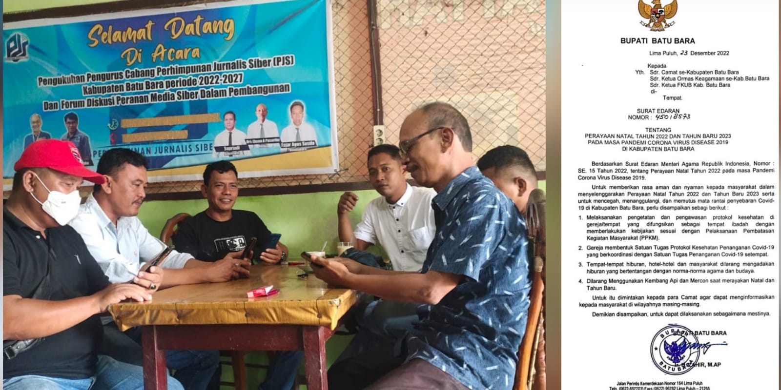 Dijelaskan, SE tersebut diterbitkan berdasarkan Surat Edaran Menteri Agama Republik Indonesia Nomor SE 15 Tahun 2022, tentang Perayaan Natal Tahun 2022 pada masa Pandemi Corona Virus Disease 2019."Kita tahu kalau tujuan penerbitan SE tersebut untuk memberikan rasa aman dan nyaman kepada masyarakat dalam menyelenggarakan Perayaan Natal Tahun 2022 dan Tahun Baru 2023 sehingga kita dukung sepenuhnya", imbuh Pasaribu.Dikatakan Ketua, melalui rapat internal PJS Batu Bara, seluruh anggota organisasi pers yang baru berdiri sekitar setahun ini telah diputuskan memberi apresiasi sekaligus mrndukung sepenuhnya penerapan SE tersebut."Karena itu kita minta seluruh pemangku kepentingan termasuk aparat penegak hukum (APH) dan Camat serta Kepala Desa/ Lurah se Kabupaten Batu Bara untuk mengaplikasikan SE tersebut dilapangan", pintanya.