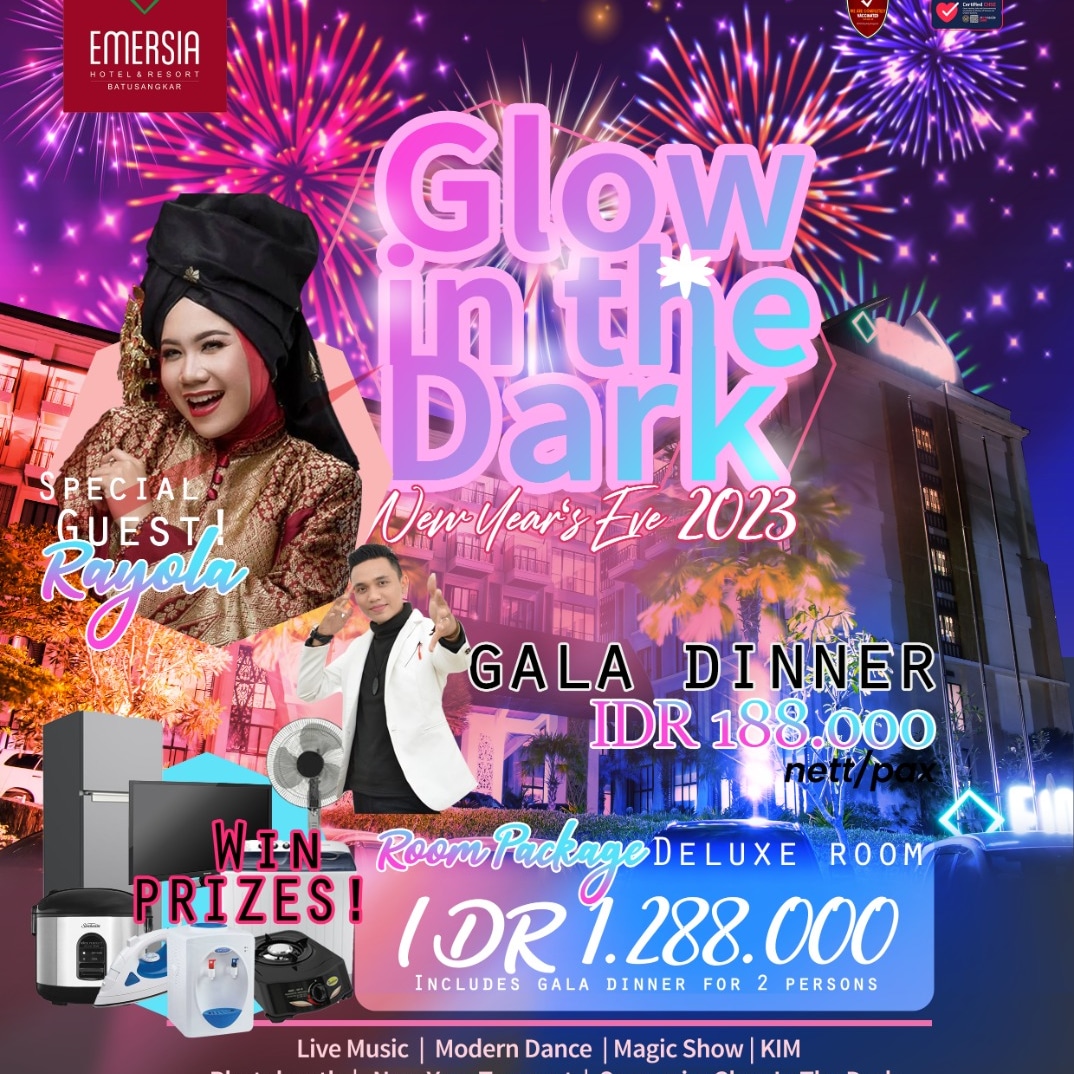 "Kami dari Emersia Hotel Batusangkar, mendoakan masyarakat selalu bahagia dan sehat, dengan menghabiskan waktu bersama keluarga, teman dan orang-orang tersayang menikmati makanan enak dan kesenangan yang menyenangkan," tutur Ismail.Gala Dinner IDR 188 K dan Room Package IDR 1.288 KSementara untuk Countdown Party di Emersia Hotel Batusangkar akan diselenggarakan di Emerald Grand Ballroom pada 31 Desember 2022 pukul 23.30 WIB sampai 1 Januari 2023 pukul 00.30 WIB.Untuk bisa menikmati layanan “Glow In The Dark”, pengunjung hanya merogoh kocek Rp188.000 per orang dan untuk Room Package Rp1.288.000,-nett. (tau)