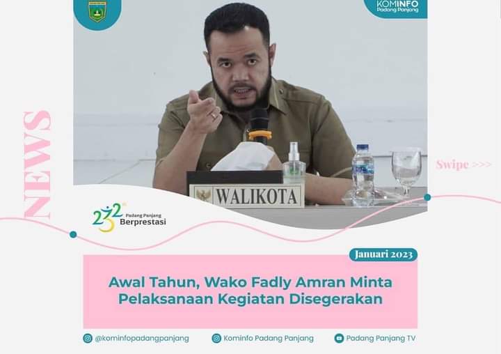 PADANG PANJANG — Wali Kota, H. Fadly Amran, BBA Datuak Paduko Malano meminta seluruh OPD tidak menunda-nunda pelaksanaan kegiatan di dinasnya masing-masing. Awal Februari, seluruh OPD segera melaksanakan kegiatan, diawali perencanaan yang saksama di Januari ini.Hal tersebut disampaikannya pada rapat awal tahun bersama Wakil Wali Kota, Drs. Asrul, Sekdako, Sonny Budaya Putra, A.P, M.Si, para asisten, staf ahli, kepala OPD, camat, lurah, serta pejabat terkait di lingkungan Pemko, Senin (2/1/2023) di Hall Lantai III Balai Kota.