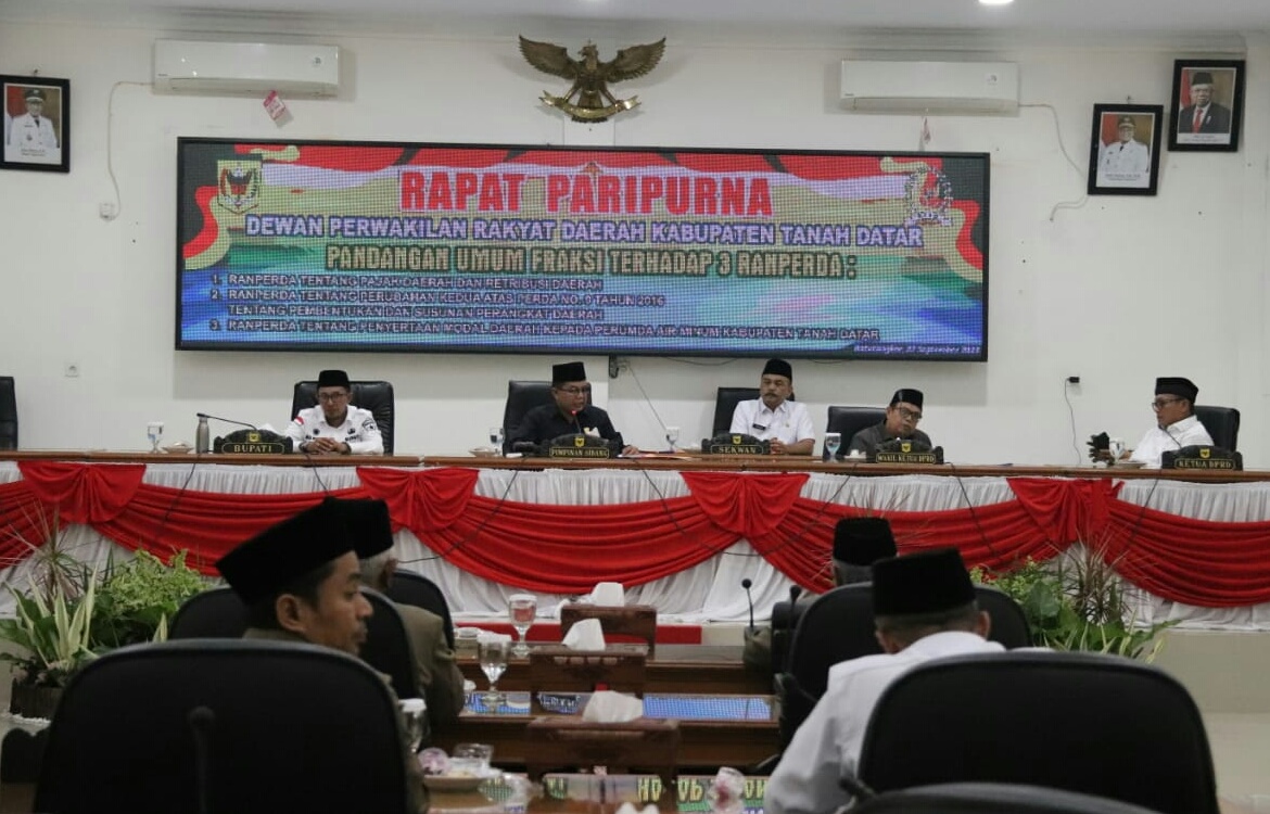 "Rapat paripurna hari ini akan mendengarkan pandangan fraksi tentang Ranperda Pajak Daerah dan Retribusi Daerah, Ranperda tentang Perubahan Kedua Atas Perda Nomor 9 Tahun 2016 tentang Pembentukan Susunan Perangkat Daerah dan Ranperda tentang Penyertaan Modal Daerah kepada Perumda Air Minum Kabupaten Tanah Datar," kata Anton.Padangan atau tanggapan Fraksi DPRD disampaikan melalui juru bicara fraksi yakni PKS Nurzal, PAN Zulli Rustam, Perjuangan Golkar Afriman, Demokrat Eri Hendri, Gerindra Kamrita, Hanura Benny Apero, PPP Arianto dan NasDem Khairul Abdi.