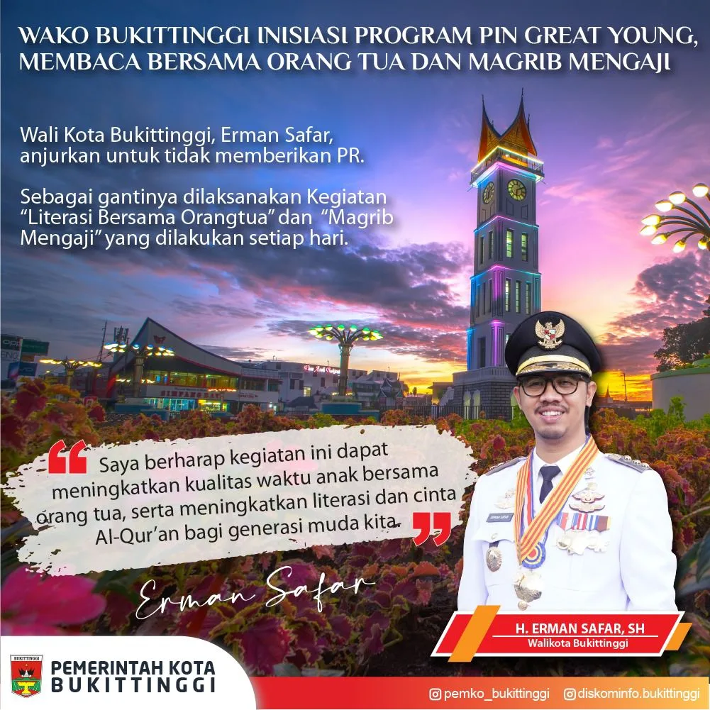 BUKITTINGGI -- Wali Kota Bukittinggi, H. Erman Safar, SH, anjurkan setiap satuan pendidikan di Bukittinggi untuk tidak memberikan PR."Kualitas waktu bersama orang tua di rumah diwujudkan dengan program PIN Great Young," ujar Erman Safar di Bukittinggi, Selasa (3/10/2023).