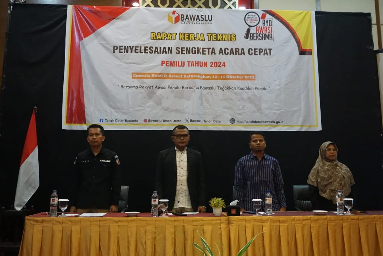 TANAH DATAR - Bawaslu Kabupaten Tanah Datar mengharapkan jajaran Panwaslu Kecamatan dapat menyelesaikan bila ada sengketa antar peserta Pemilu."Mekanisme penyelesaian sengketa antar peserta Pemilu (PSAP) dapat diselesaikan oleh Panwaslu Kecamatan sesuai wilayah kerja masing-masing dengan dasar surat mandat yang diberikan oleh Bawaslu Kabupaten,” kata Ketua Bawaslu Kabupaten Tanah Datar Andre Azki saat penutupan Rakernis PSAP di Emersia Hotel Batusangkar, Rabu (11/10/2023).