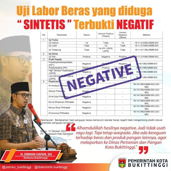 Disampaikan Erman, uji labor dari sampel beras diduga sintetis di kota Bukittinggi hasilnya negatif."Dugaan dan kecurigaan selama ini, tidak benar, bahwa ada beras sintetis di Bukittinggi," paparnya.
