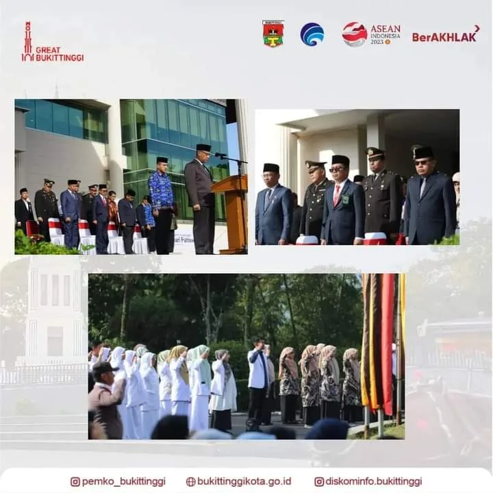 BUKITTINGGI -- Pemko Bukittinggi gelar upacara bendera dalam rangka Hari Pahlawan ke 78 tahun 2023 dan Hari Kesehatan Nasional ke 59.Upacara dilaksanakan di Halaman Balaikota Bukittinggi, Jumat (10/11/2023), Wakil Wali Kota Bukittinggi, Marfendi bertidak selaku inspektur upacaranya.