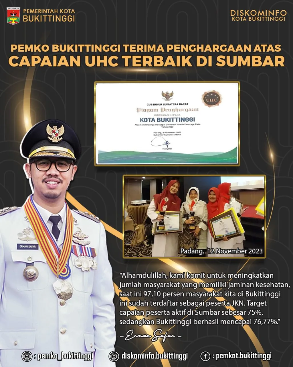 BUKITTINGGI -- Pemerintah Kota Bukittinggi mendapat peringkat terbaik di Sumatra Barat dalam akses layanan kesehatan masyarakat, khususnya pada capaian program UHC. Penghargaan diberikan langsung Gubernur Sumbar kepada Wali Kota Bukittinggi diwakili Kepala Dinas Kesehatan, di Pangeran Beach Hotel, Minggu (12/11/2023)Wali Kota Bukittinggi, melalui Kepala Dinas Kesehatan, Linda Faroza, menjelaskan, Kota Bukittinggi dapat penghargaan, atas capaian UHC terbaik di Sumatra Barat. Pemko Bukittinggi dinilai menjadi daerah paling terbaik dalam memberikan akses pelayanan kesehatan dan memfasilitasi masyarakat dengan cepat terhadap kebutuhan kesehatan, serta usulan kepesertaan jaminan kesehatan masyarakat yang butuh pelayanan kesehatan baru, melalui program Bukittinggi Hebat maupun JKSS.