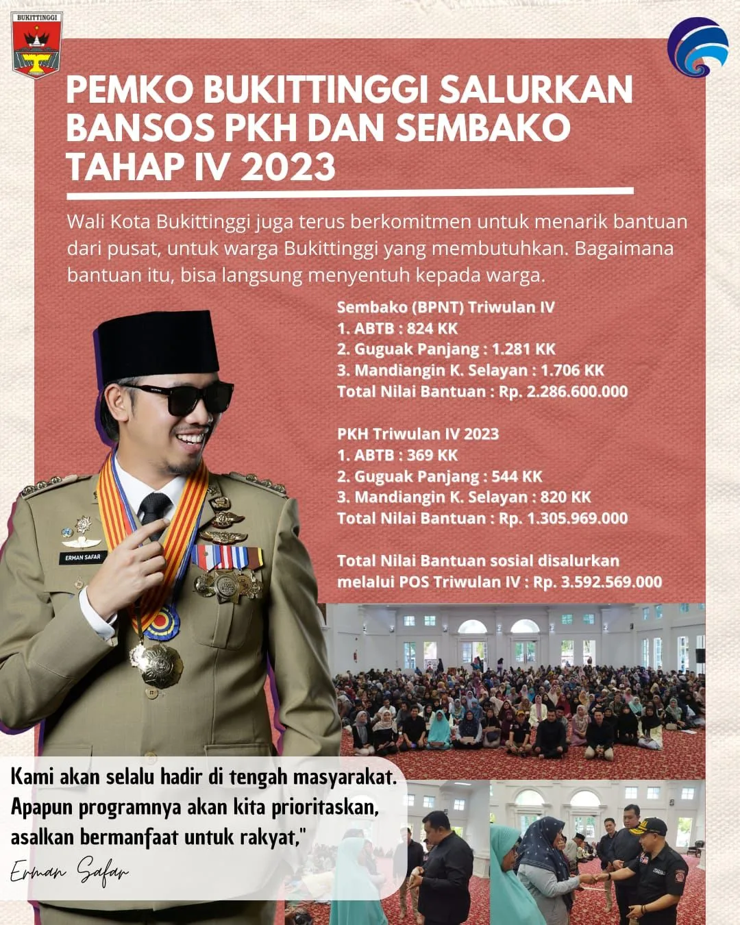 Wali Kota Bukittinggi, Erman Safar, Selasa (5/12/2023), kepada media ini menjelaskan, penyaluran untuk triwulan IV tahun 2023 telah sesuai dengan penerima.Dalam menyalurkan bantuan sosial kepada 3818 KPM di Kota Bukittinggi ini, penerima merupakan warga yang berhak mendapatkan bantuan dan terdaftar dalam DTKS Kota Bukittinggi.