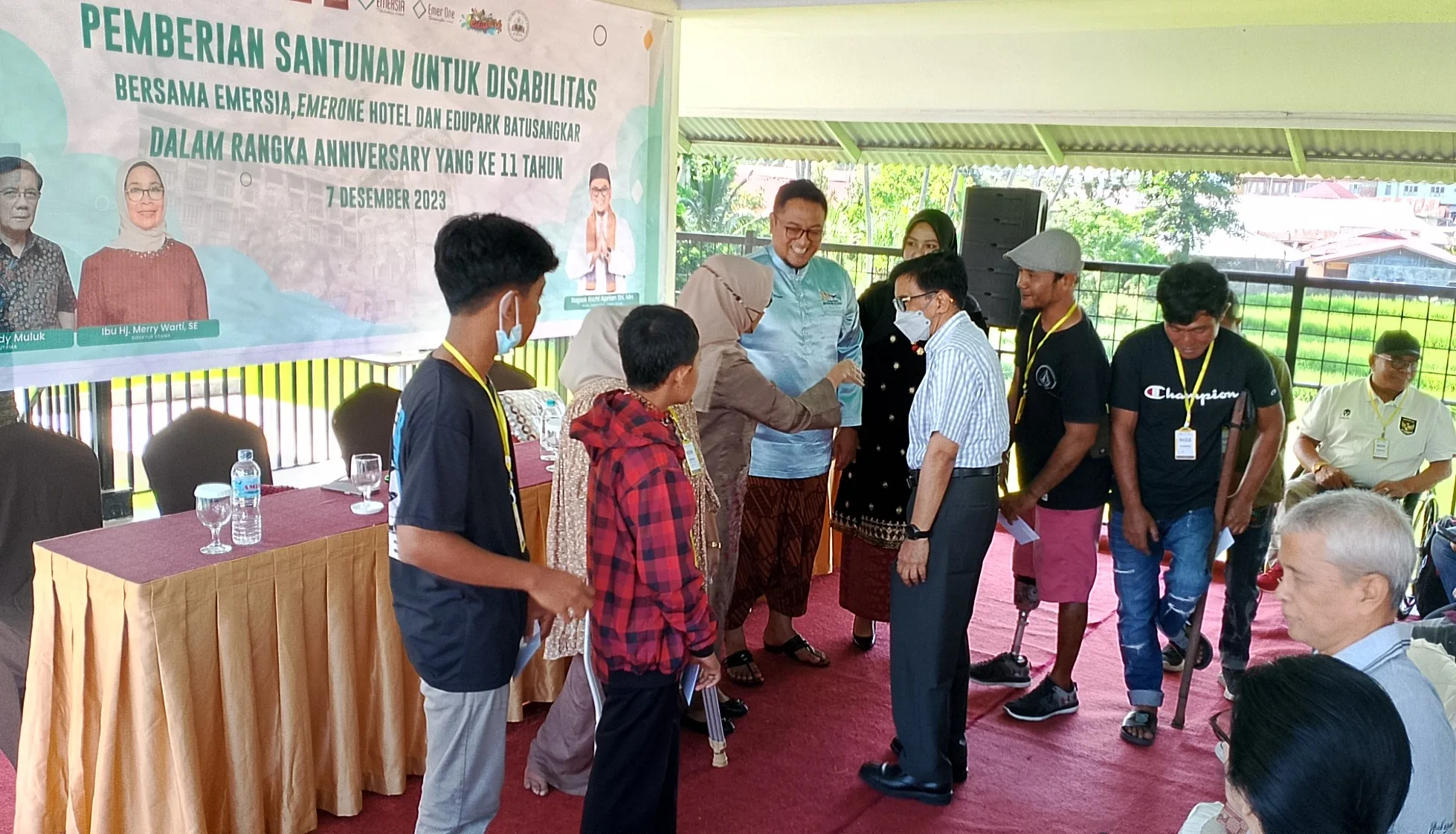 TANAH DATAR - Dalam rangka memperingati hari jadi Emersia Grup ke 11 dan Emersia Hotel Batusangkar ke 6, Emersia Grup memberikan santunan kepada 200 warga disabilitas di Kabupaten Tanah Datar di Emerone Hotel Batusangkar, Kamis (7/12/2023).Pemberian santunan diserahkan oleh Wakil Bupati Tanah Datar, Richi Aprian, Owner Emersia Merry Warti, Komisaris Emersia Grup Erdi Muluk, Ketua Yayasan Indo Jolito Peduli Astri Asgani, Ketua GOW Tanah Datar Ny. Patty Richi Aprian, dan GM Emersia Batusangkar Indra Muaz.