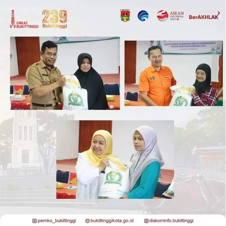 BUKITTINGGI -- Sebanyak 4.730 warga kota Bukittinggi pada tahap II periode Desember 2023 menerima Cadangan Pangan Pemerintah (CPP), Selasa (12/12/2023).Bantuan secara simbolis diserahkan Wali Kota Bukittinggi, Erman Safar, diwakili Sekda, Martias Wanto, di Aula Kantor Pos Kota Bukittinggi.