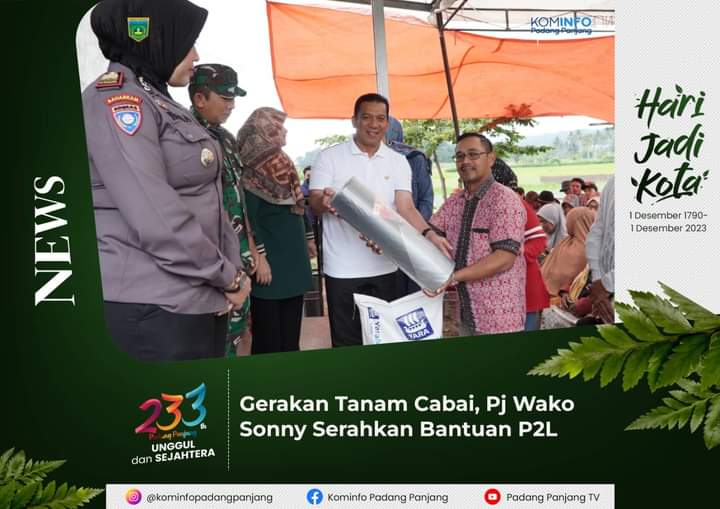 PADANG PANJANG -- Penjabat (Pj) Wali Kota, Sonny Budaya Putra, A.P, M.Si serahkan bantuan sarana produksi cabai pada kegiatan Gerakan Tanam Cabai dan Penyerahan Bantuan Pekarangan Pangan Lestari (P2L) Kota Padang Panjang 2023 untuk empat Kelompok Wanita Tani (KWT), Jumat (22/12/2023).Dalam sambutannya pada acara yang digelar di KWT Berkah Kita Perumahan Sago, Kelurahan Ngalau itu, Sonny menyampaikan terima kasih kepada Dinas Pangan dan Pertanian (Dispangtan) yang telah menggagas kegiatan ini.