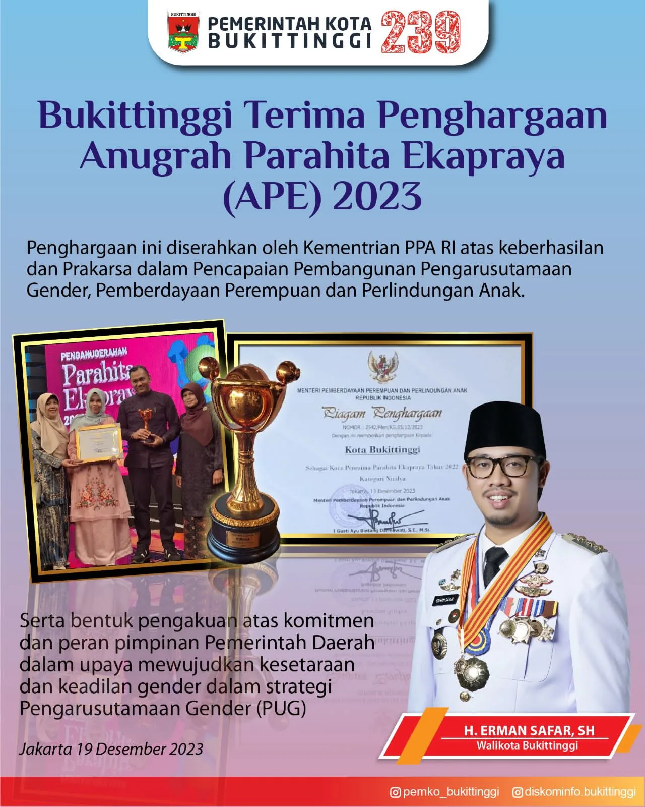 BUKITTINGGI -- Pemerintah Kota Bukittinggi terima Anugrah Parahita Ekapraya (APE), tahun 2023. Penghargaan tersebut, diserahkan di Gedung Metro TV Kebun Jeruk, Jakarta Barat, Selasa (19/12/2023).Parahita Ekapraya merupakan penganugerahan yang diberikan kepada Kementerian/Lembaga dan Pemerintah Daerah Provinsi dan Pemerintah Daerah Kabupaten/Kota sebagai bentuk pengakuan atas komitmen dan peran para pimpinan Kementerian/Lembaga dan Pemerintah Daerah dalam upaya mewujudkan kesetaraan gender dan pemberdayaan perempuan dalam berbagai bidang pembangunan.