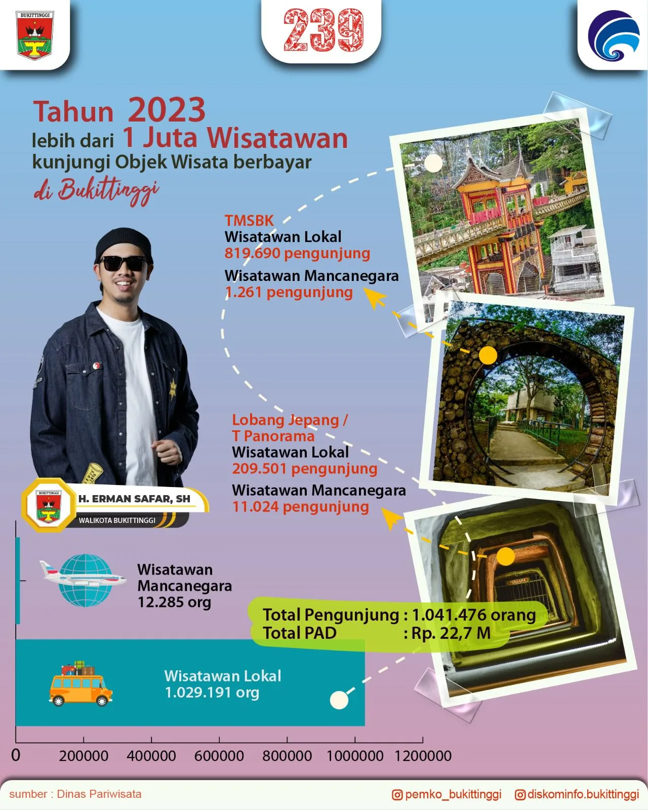 Wali Kota Bukittinggi, H. Erman Safar, SH, didampingi Kepala Dinas Pariwisata, Rofie Hendra, mengungkapkan, sasaran Dinas Pariwisata Tahun 2023 dalam menjalankan misi Pemerintah Kota Bukittinggi yaitu “Hebat dalam Sektor Kepariwisataan, Seni Budaya dan Olahraga”, meningkatnya pengelolaan destinasi pariwisata daerah dan meningkatnya perkembangan ekonomi kreatif daerah. Dengan tingginya jumlah kunjungan wisatawan, tentu akan berdampak pada penigkatan ekonomi kreatif di Kota bukittinggi melalui UMKM yang ada.“Selama 2023 total pengujung objek wisata berbayar di Bukittingi sebanyak 1.041.476 orang masuk ke objek wisata berbayar kita, TMSBK, Benteng Fort de Kock dan juga Taman Panorama Lobang Jepang. Selama satu tahun itu, objek wisata berbayar kita itu, menghasilkan PAD sebesar Rp 22.706.416.500,-,” ungkapnya. (dyt/rls) Editor : Mangindo Kayo