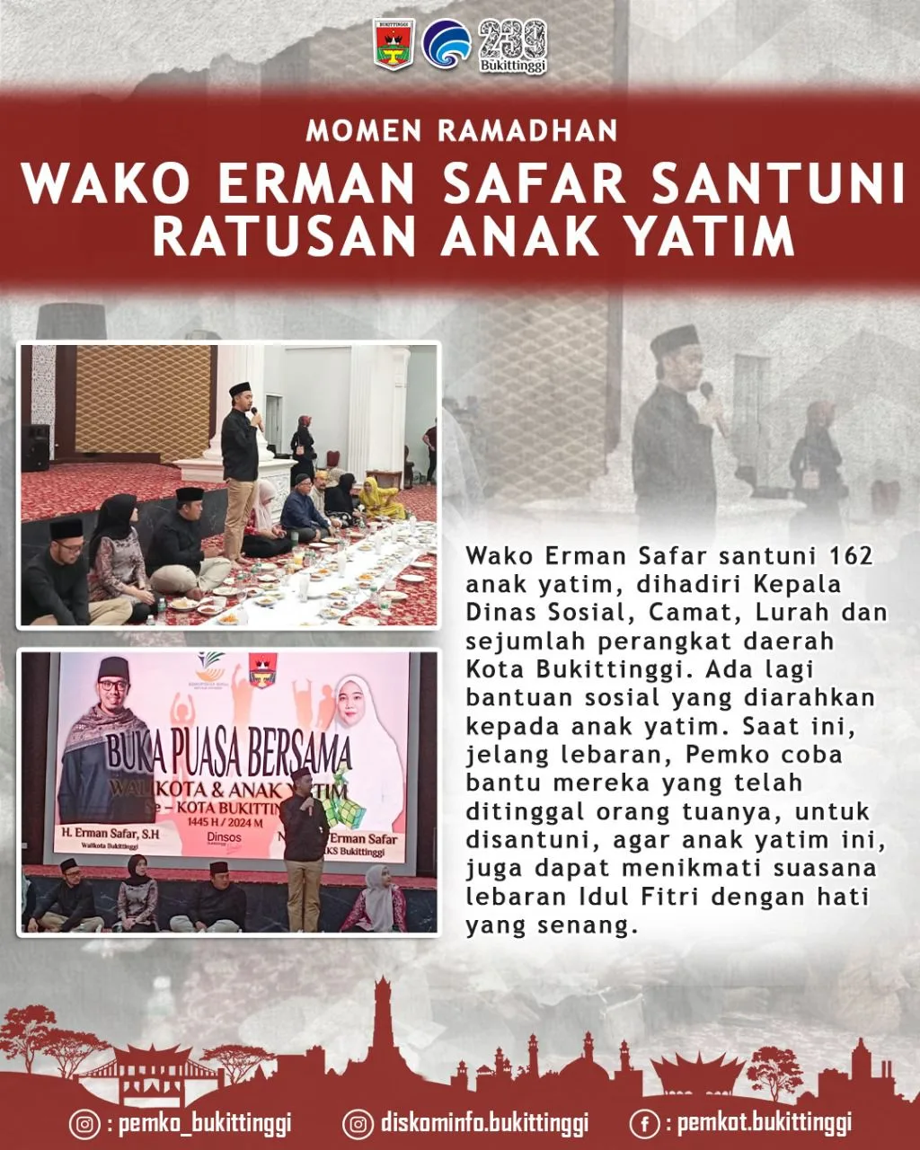Ada lagi bantuan sosial yang diarahkan kepada anak yatim. Saat ini, jelang lebaran, Pemko coba bantu mereka yang telah ditinggal orang tuanya, untuk disantuni, agar anak yatim ini, juga dapat menikmati suasana lebaran Idul Fitri dengan hati yang senang.Dalam kegiatan buka bersama itu, Wako Erman Safar santuni 162 anak yatim, dihadiri Kepala Dinas Sosial, Camat, Lurah dan sejumlah perangkat daerah Kota Bukittinggi. (dyt) Editor : Mangindo KayoMomen Ramadhan, Wako Erman Safar Santuni Ratusan Anak Yatim
