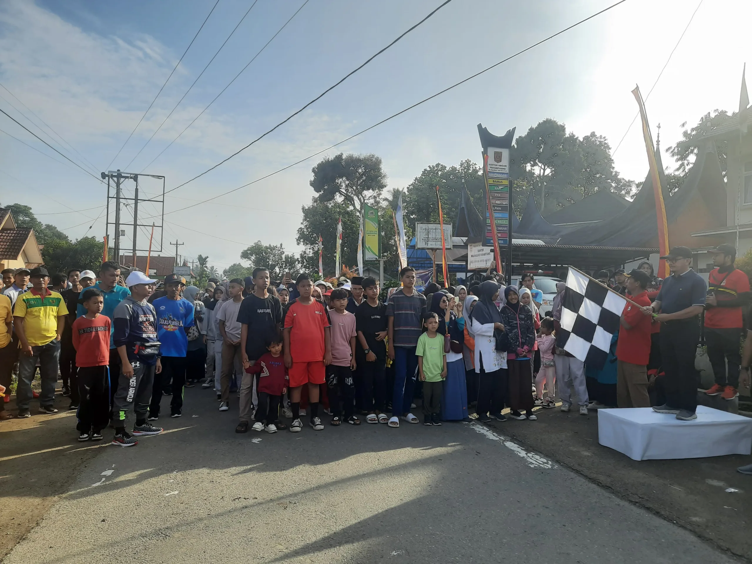 AGAM -- Persaudaraan Anak Nagari Panampuang dan Karang Taruna Nagari Panampuang menggelar acara jalan sehat dalam rangka memeriahkan hari raya Idul Fitri, Minggu (14/4/2024).Acara ini bertujuan untuk menjalin silaturahim antar warga dan perantau yang pulang pada libur lebaran.
