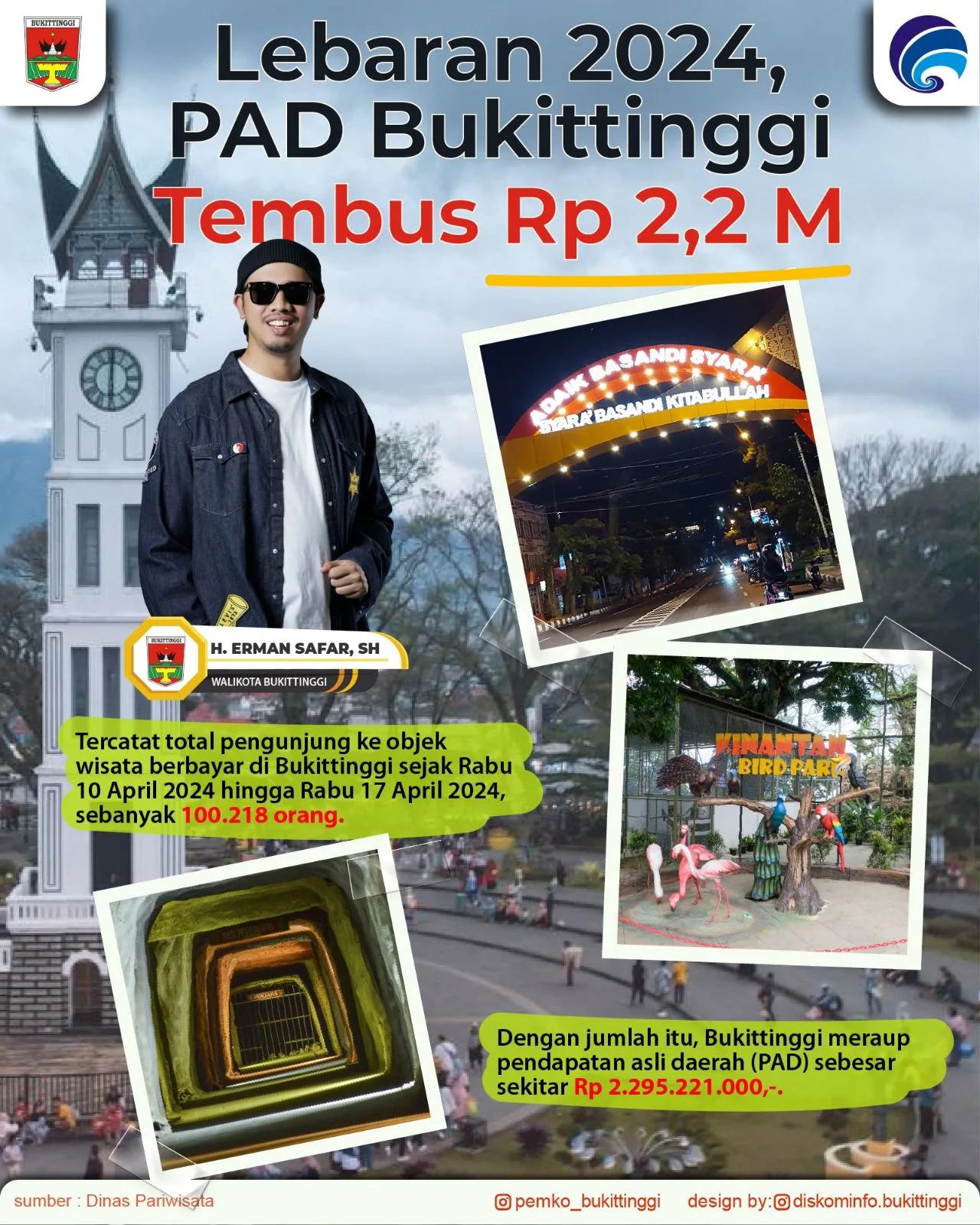 BUKITTINGGI -- Pemko Bukittinggi mencatat kunjungan wisata selama libur Lebaran 1445 H mencapai 100 ribu lebih."Data itu diambil dari hitungan wisatawan datang ke tiga tempat wisata primadona Kota Bukittinggi," kata Wako Erman Safar, Kamis (18/4/2024).