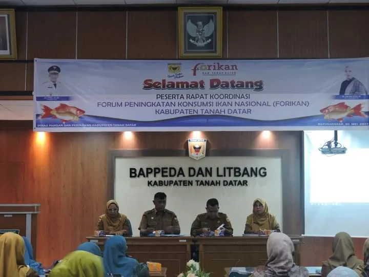 TANAHDATAR, Bacalahnews - Pemkab Tanah Datar menggelar Rapat Koordinasi Forum Peningkatan Konsumsi Ikan (Forukan) Nasional tingkat Kabupaten Tanah Datar di Aula Bappeda dan Litbang, Senin (6/5/2024).Sekretaris Daerah Tanah Datar Iqbal Ramadi Payana menyampaikan ikan sebagai salah satu sumber protein hewani merupakan solusi yang tepat dalam penyediaan gizi yang sehat, halal dan baik bagi keluarga.