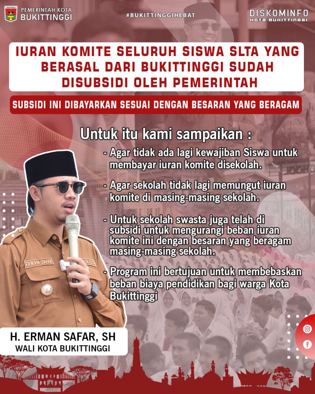 Wali Kota Bukittinggi, Erman Safar, menjelaskan, bidang pendidikan, tetap menjadi prioritas bagi Pemko Bukittinggi. Setiap jenjang pendidikan diberikan program yang berkualitas dan membebaskan warga dari beban keuangan.“Tahun ini, kita Pemko Bukittinggi telah mensubsidi uang komite bagi pelajar SLTA yang berdomisili di Kota Bukittinggi, Subsidi ini dibayarkan sesuai dengan besaran yang beragam untuk masing-masing sekolah,” ungkap Wako.