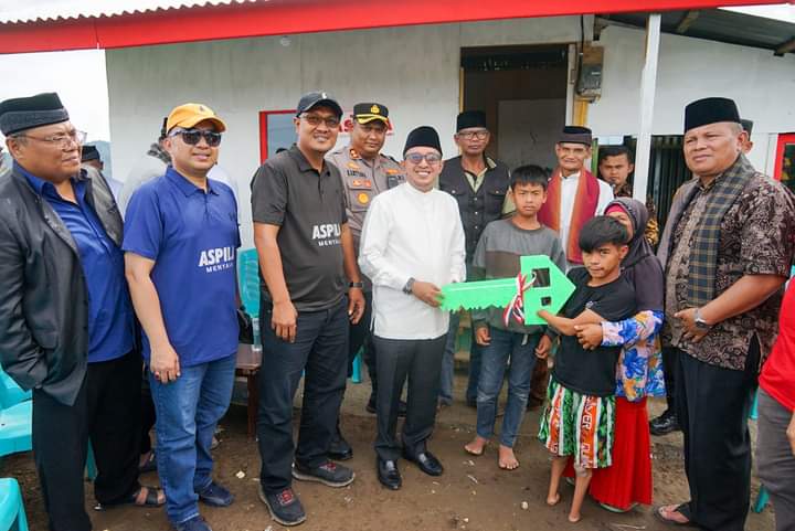 TANAHDATAR, Bacalahnews - Satu unit Rumah Hunian Sementara (Huntara) selesai dibangun oleh Kelompok Aksi Solidaritas Piaman Laweh (ASPILA) di Nagari Paninjauan, Kecamatan X Koto, untuk korban banjir bandang dan galodo.Ketua ASPILA Azwar Anas menyerahkan secara simbolis kunci Rumah Huntara kepada Bupati Tanah Datar Eka Putra, Minggu (30/6/2024) yang kemudian diserahkan kepada korban bencana banjir bandang dan galodo.