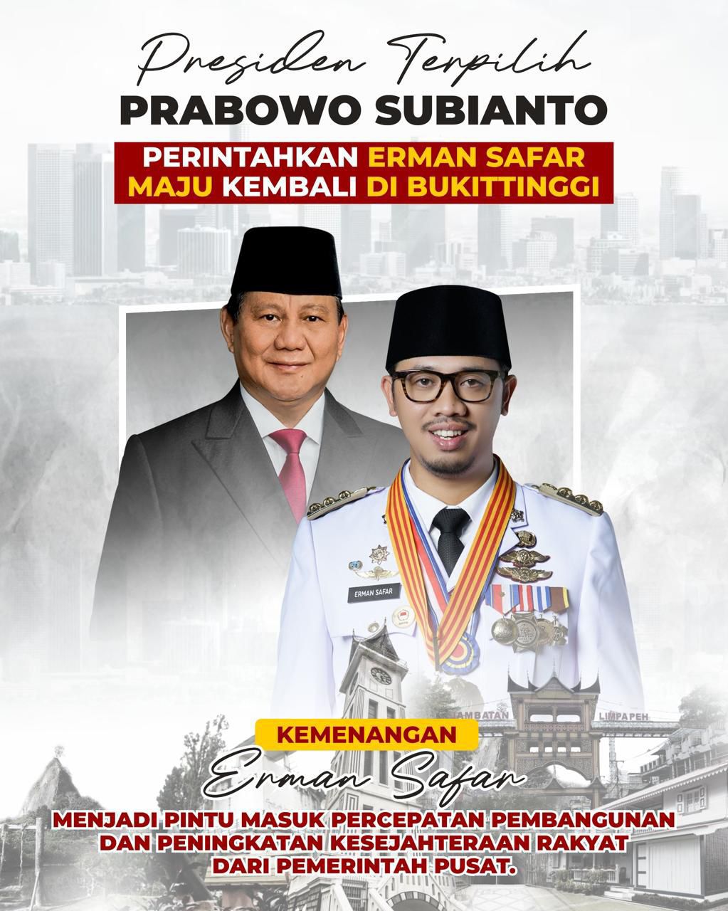 ” Kemenangan Erman Safar menjadi pintu masuk percepatan pembangunan dan peningkatan kesejahteraan rakyat dari pemerintahan pusat,” Prabowo perintahkan Erman safar maju kembali di kota Bukittinggi, ” ujarnya. (Ydt)