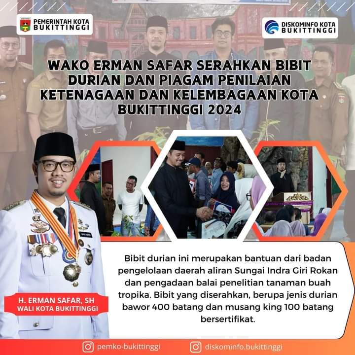 BUKITTINGGI -- Pemerintah Kota Bukittinggi melalui Dinas Pertanian dan Pangan, serahkan bibit durian, sekaligus Piagam Penghargaan dan Hadiah bagi pemenang Penilaian Ketenagaan dan Kelembagaan Tingkat Kota Bukittinggi Tahun 2024. Kegiatan ini berlangsung di Hall SKB Panorama Baru, Senin (22/7/2024).Wali Kota Bukittinggi, Erman Safar, menyampaikan, bibit durian ini merupakan bantuan dari badan pengelolaan daerah aliran Sungai Indra Giri Rokan dan pengadaan balai penelitian tanaman buah tropika. Bibit yang diserahkan, berupa jenis durian bawor 400 batang dan musang king 100 batang bersertifikat.