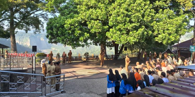 BUKITTINGGI - Dinas Pariwisata Bukittinggi laksanakan apel gabungan bersama seluruh jajarannya dengan tujuan mencari inovasi baru dan meningkatkan pendapatan. Kegiatan ini berlangsung di Taman Panorama Ngarai Sianok pada Senin (5/8/2024).Kegiatan ini dihadiri oleh Kepala Dinas Pariwisata Kota Bukittinggi, Rofie Hendria, didampingi oleh Kabid, JFT, ASN & PPPK Dispar, petugas outsourcing, serta mahasiswa/i PKL.