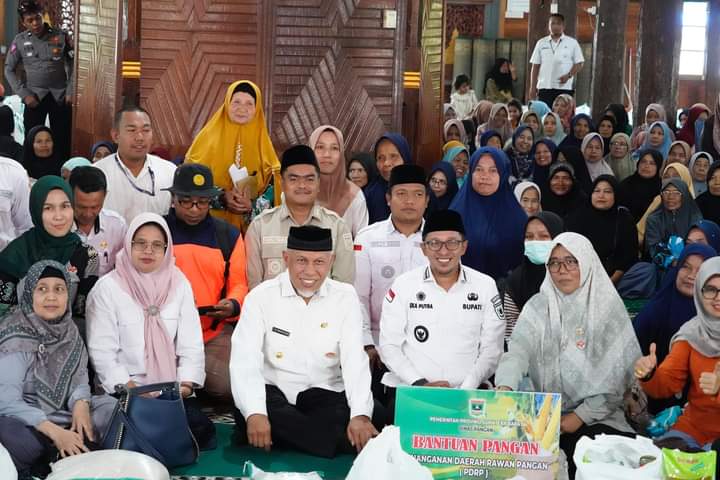TANAH DATAR - Masyarakat Tanah Datar yang terdampak Banjir Bandang dan Tanah Longsor menerima paket Sembako dari Pemerintah Provinsi (Pemprov) Sumatera Barat (Sumbar), yang dibagikan di Masjid Raya Lima Kaum, Rabu (21/8/2024).Paket Sembako sebanyak 650 buah itu, diserahkan secara simbolis oleh Gubernur Sumbar Mahyeldi didampinggi Bupati Tanah Datar Eka Putra, disaksikan Plt. Kepala Dinas Pangan Provinsi Sumbar Derry Swasti, Sekretaris Camat Lima Kaum Sri Handayani dan beberapa Wali Nagari.