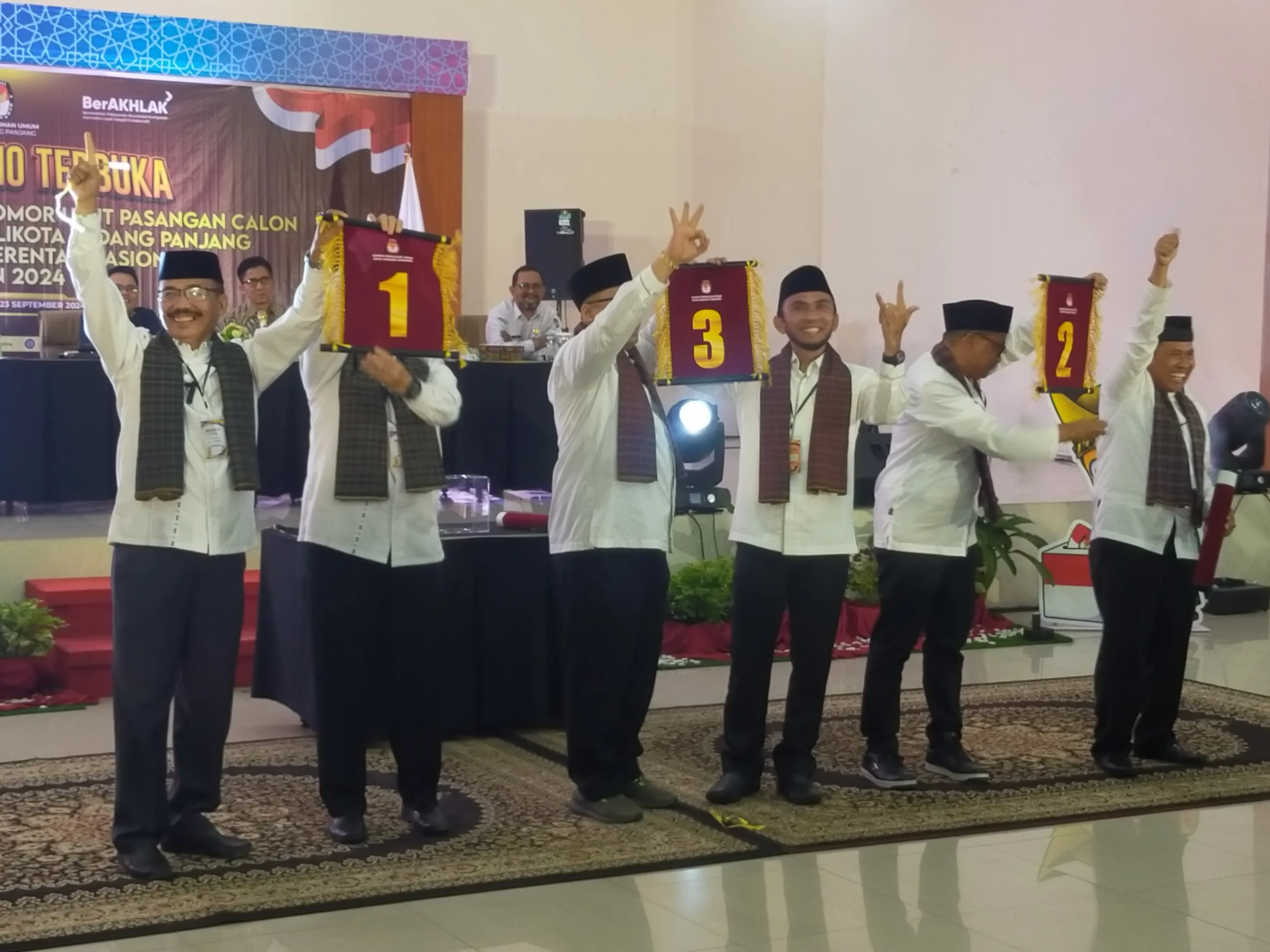 Padang Panjang - Komisi Pemilihan Umum Kota Padang Panjang, Sumbar, menetapkan nomor urut para Calon Wali Kota setempat, Senin (23/9/24).Ketua KPU Padang Panjang Puliandri menyebutkan pelaksanaan pemilihan nomor urut tersebut merupakan salah satu tahapan Pemilu Kepala Daerah di kota itu.