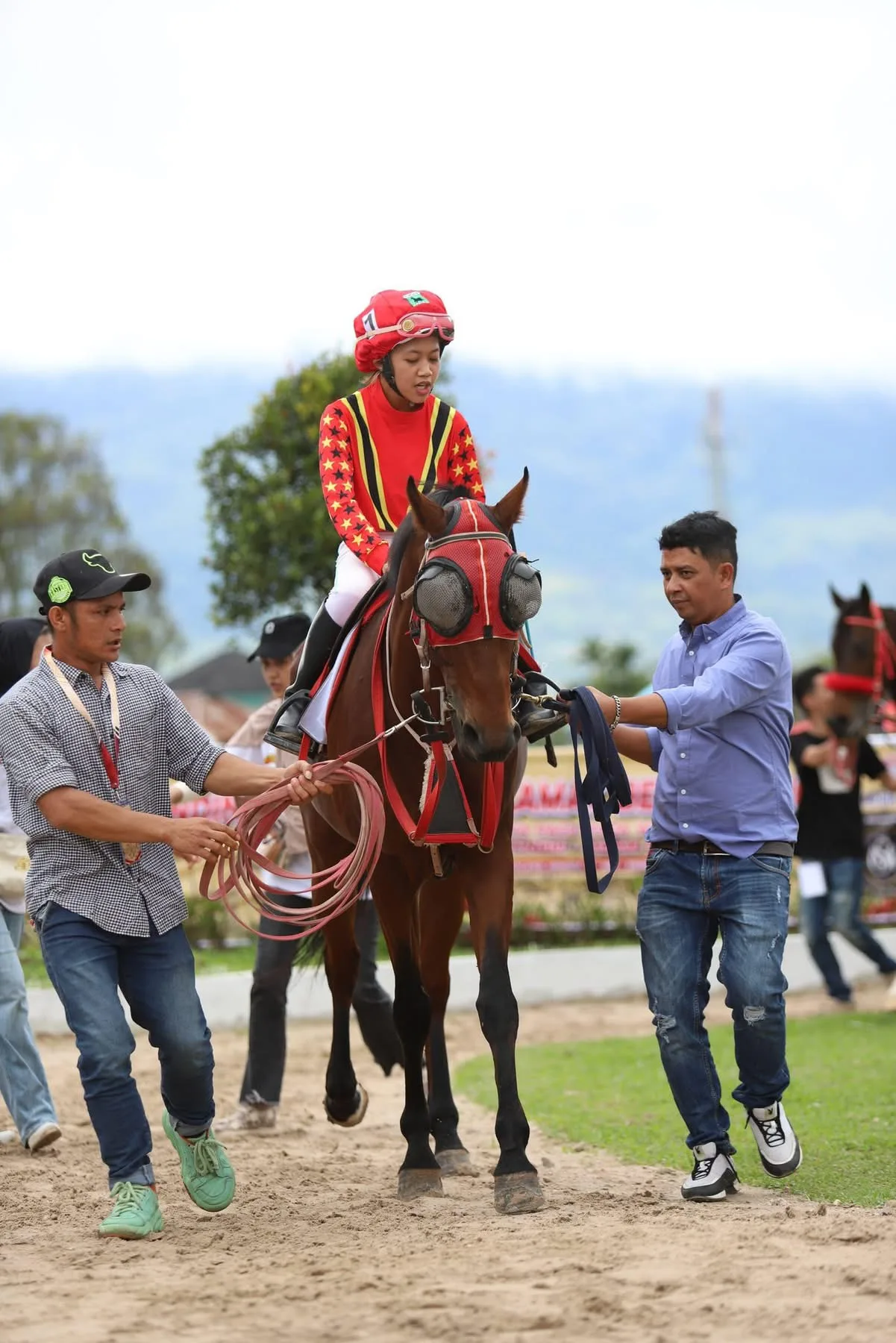 BUKITTINGGI -- Membanggakan, joki perempuan Najla Al Balkis asal Padang Panjang pertama kali mengukir prestasi di ajang Pacuan Kuda Wisata Derby 2025 yang berlangsung di Gelanggang Bukit Ambacang Kota Bukittingi, Ahad (11/5/2025).