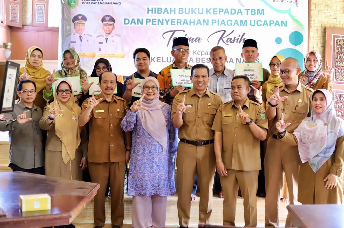 PADANG PANJANG — Pemerintah Kota serahkan Hibah Buku bagi Taman Bacaan Masyarakat (TBM) dan perpustakaan masjid serta Piagam Ucapan Terima Kasih kepada keluarga sastrawan ternama, almarhum A.A Navis, Selasa (3/6/2025) di Pusat Dokumentasi dan Informasi Kebudayaan Minangkabau (PDIKM).Penyerahan piagam dilakukan Sekdako, Sonny Budaya Putra dan diterima putri almarhum A.A Navis, Gemala Ranti disaksikan sejumlah kepala Organisasi Perangkat Daerah (OPD), serta perwakilan dari Museum Adityawarman.