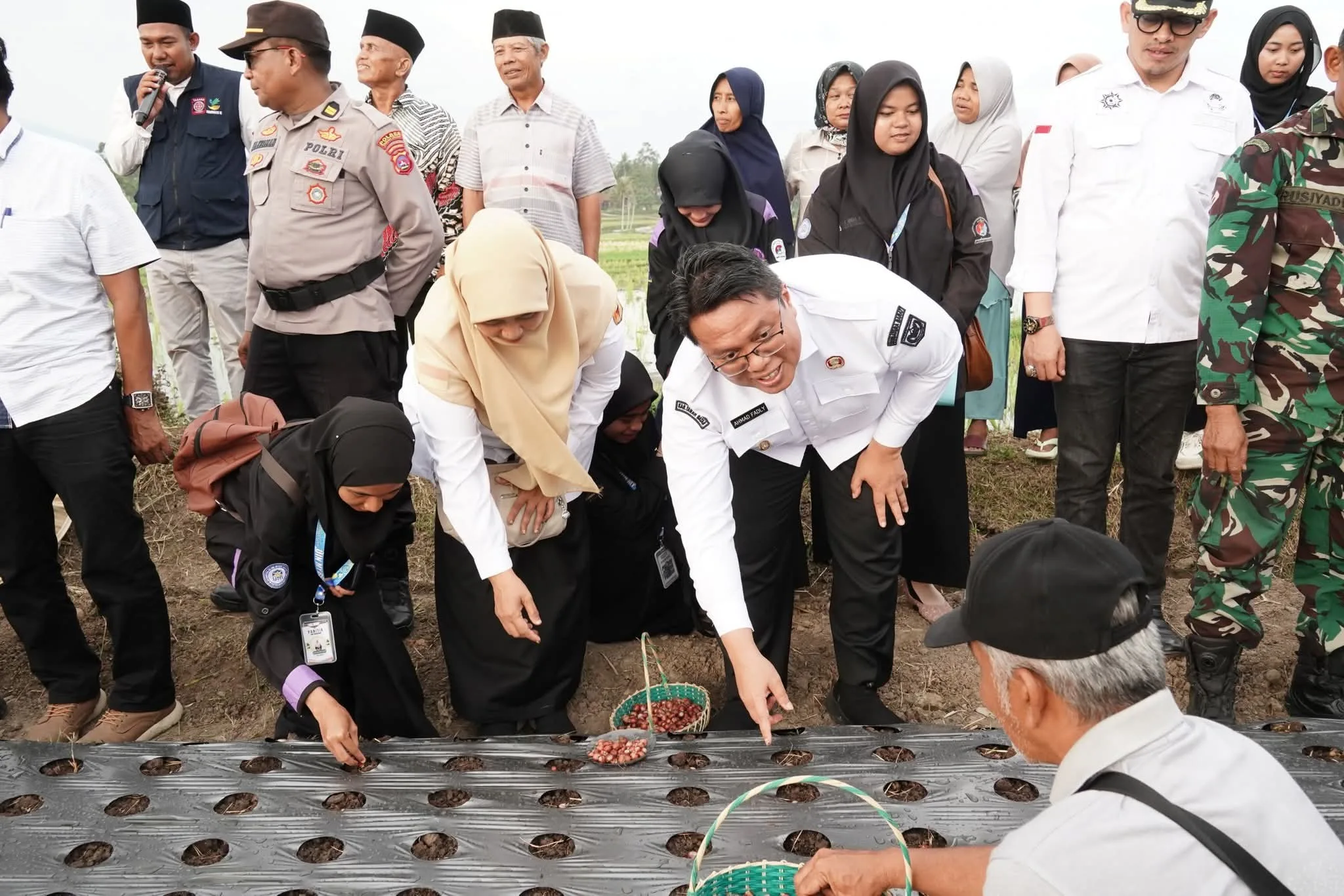 TANAH DATAR, Bacalahnews - Petani di Nagari Cubadak, Kecamatan Limo Kaum, bertekad menjadikan daerah tersebut sebagai sentra tanaman Bawang Merah.Wakil Bupati Tanah Datar Ahmad Fadly didampingi Kadis Pertanian Sri Mulyani, Kadis Pangan Harfian Fikri, Camat Limo Kaum Ikrar Fahlefi, dan Ketua Kelompok Tani Bawang Merah dan Cabe (BMC) Jaya Nagari Cubadak Itri Nofios melakukan penanaman bibit Bawang Merah di hamparan lahan kelompok tani BMC Jaya Nagari Cubadak, Rabu (4/6/2025).