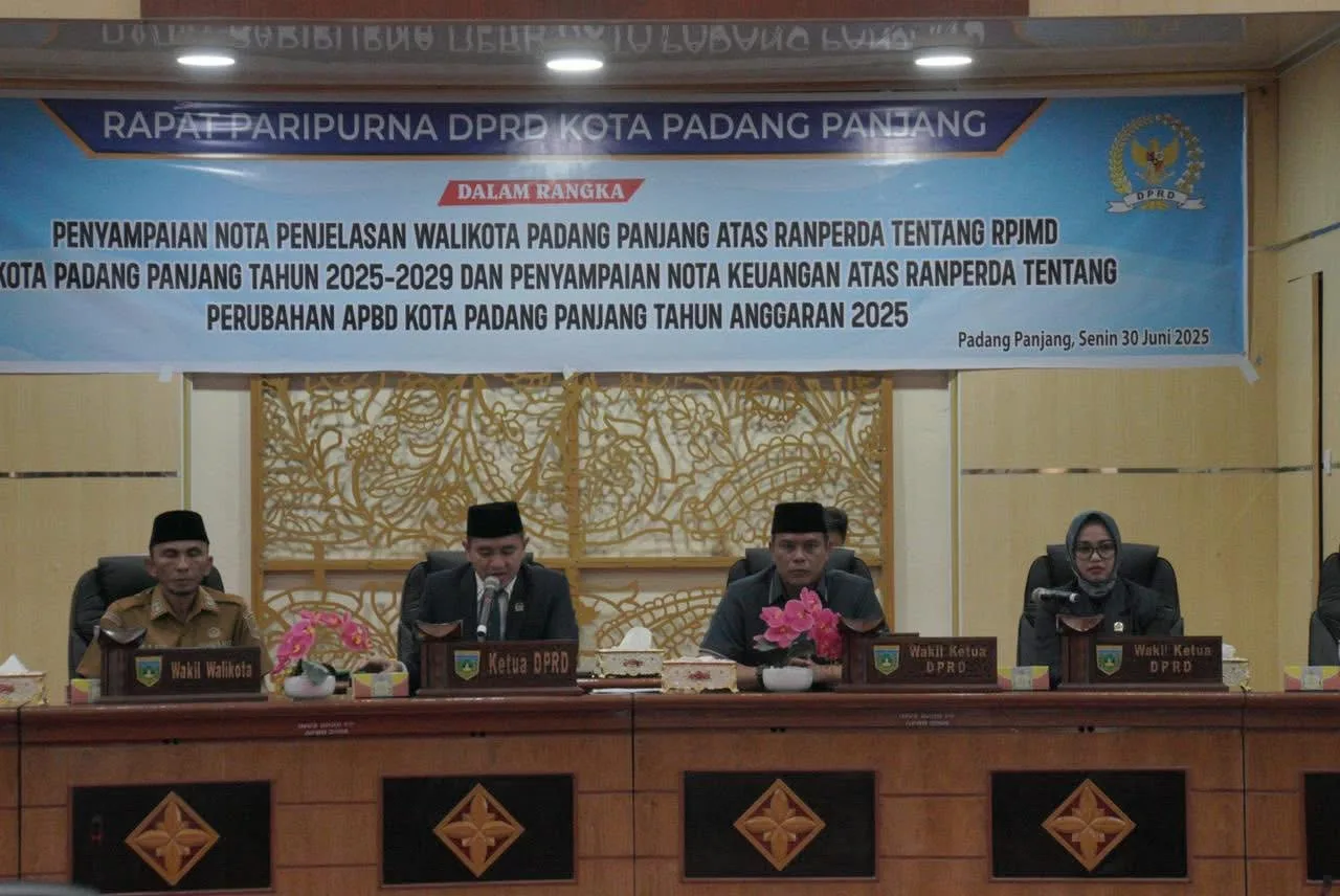PADANG PANJANG -- Wakil Wali Kota, Allex Saputra sampaikan Nota Penjelasan Wali Kota atas Ranperda Rencana Pembangunan Jangka Menengah Daerah (RPJMD) 2025-2029 dan Ranperda tentang Perubahan APBD Kota Padang Panjang Anggaran 2025 pada Rapat Paripurna di Gedung DPRD, Senin (30/6/2025).Dalam rapat yang dipimpin Ketua DPRD, Imbral didampingi Wakil Ketua, Mardiansyah dan Nurafni Fitri itu, Wawako Allex mengungkapkan, pembangunan kota saat ini diarahkan pada sektor perdagangan, reparasi kendaraan, kepariwisataan, pertanian, kehutanan, perikanan, dan jasa pendidikan.