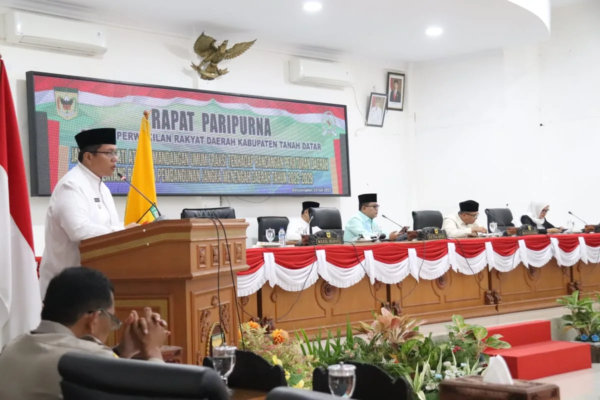 TANAH DATAR, Bacalahnews - DPRD Tanah Datar mendengarkan jawaban Wabup Ahmad Fadly atas Pemandangan Umum Fraksi terhadap Ranperda tentang Rencana Pembangunan Jangka Menengah Daerah (RPJMD) Tahun 2025-2029, dalam rapat paripurna dewan, Jumat (11/7/2025).Rapat Paripurna dipimpin Ketua DPRD Anton Yondra didampingi Wakil Ketua Nurhamdi Zahari dan Kamrita, dan 24 anggota dewan, Sekwan Yuhardi, serta dihadiri Wabup Ahmad Fadly, Forkopimda, Sekda, staf ahli Bupati, para asisten, kepala OPD, camat, dan Wali Nagari.