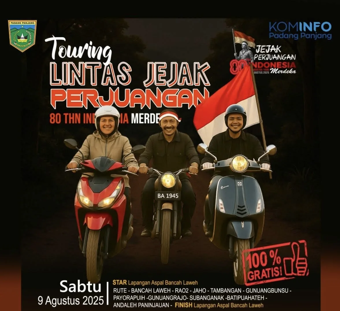 PADANG PANJANG – Merayakan 80 tahun Kemerdekaan Republik Indonesia, komunitas Flippers akan menggelar kegiatan Touring Lintas Jejak Perjuangan pada Sabtu, (9/8/2025) mendatang.Hal ini disampaikan Koordinator Touring Lintas Jejak Perjuangan, Tonny. Dijelaskannya, kegiatan tersebut akan dimulai pukul 08.00 WIB dari Lapangan Aspal Bancalaweh.