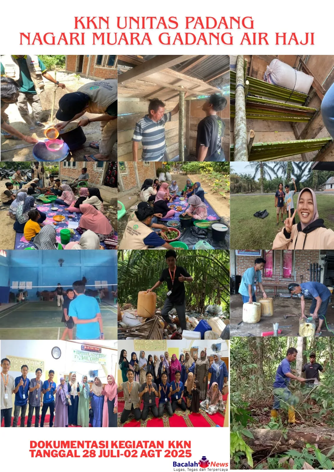 KAB. PESISIR SELATAN, (28 Juli - 2 Agustus 2025) - Pada minggu ketiga pelaksanaan Kuliah Kerja Nyata (KKN), mahasiswa KKN di Nagari Muaro Gadang telah menunjukkan dedikasi dan semangat yang tinggi dalam melaksanakan program kerja mereka. Selama sepekan, mereka telah melakukan berbagai kegiatan yang bermanfaat bagi masyarakat Nagari Muaro Gadang, mulai dari pertanian organik hingga kegiatan keagamaan. Dengan kerja sama yang baik antara mahasiswa KKN dan masyarakat, kegiatan ini diharapkan dapat memberikan manfaat yang berkelanjutan bagi Nagari Muaro Gadang.