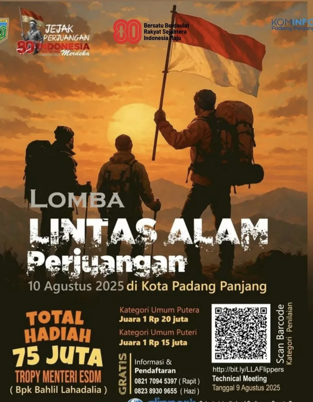 PADANG PANJANG – Memeriahkan Hari Ulang Tahun ke-80 Kemerdekaan Republik Indonesia (HUT RI), komunitas Flippers akan menggelar Lomba Lintas Alam Perjuangan, Ahad (10/8/2025).Sekretaris Panitia Lomba, Hazi mengatakan, kegiatan akan dimulai pukul 09.00 WIB dengan titik start di Pusat Dokumentasi dan Informasi Kebudayaan Minangkabau (PDIKM). Peserta akan berkompetisi dalam tim beranggotakan tiga orang, dengan dua kategori yang diperlombakan, umum putra dan umum putri.