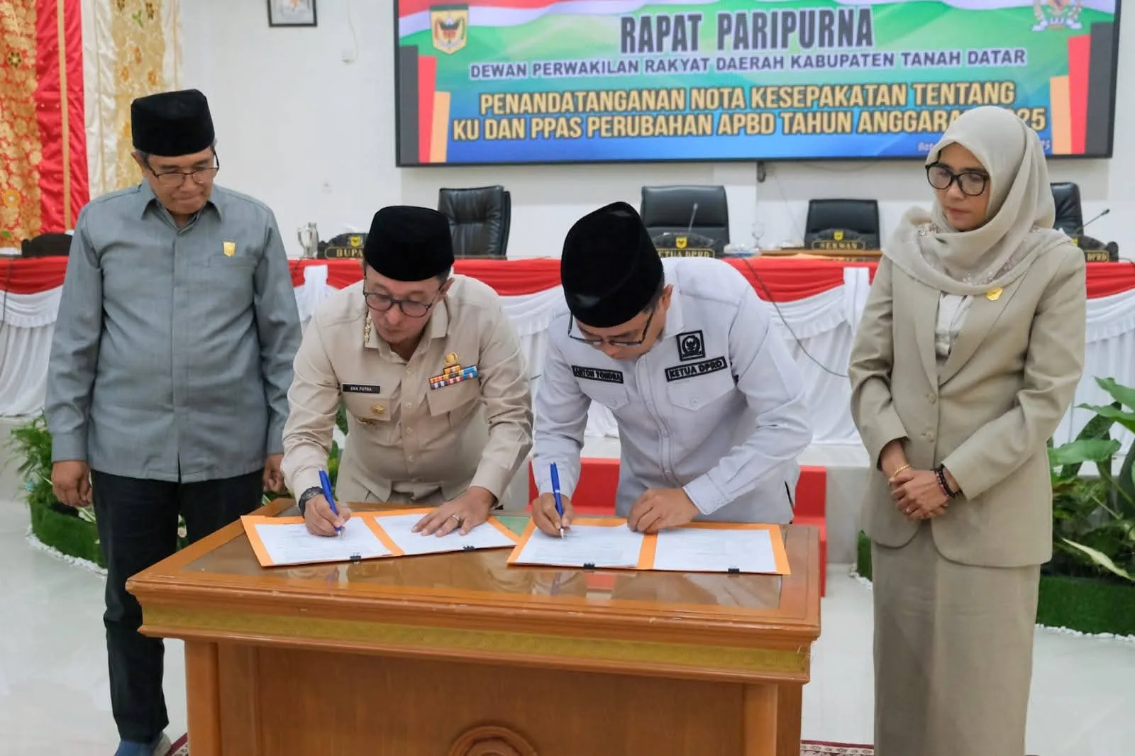 Bupati Eka Putra menyampaikan terima kasih kepada Ketua dan Wakil Ketua DPRD, ketua fraksi, dan pihak terkait lainnya sehingga KU PPAS Perubahan APBD 2025 disepakati dan ditandatangani bersama."Penandatanganan ini sebagai pedoman bagi Pemkab Tanah Datar untuk menyusun Rencana Kerja dan Anggaran (RKA) Perubahan APBD Tahun Anggaran 2025," kata Eka.