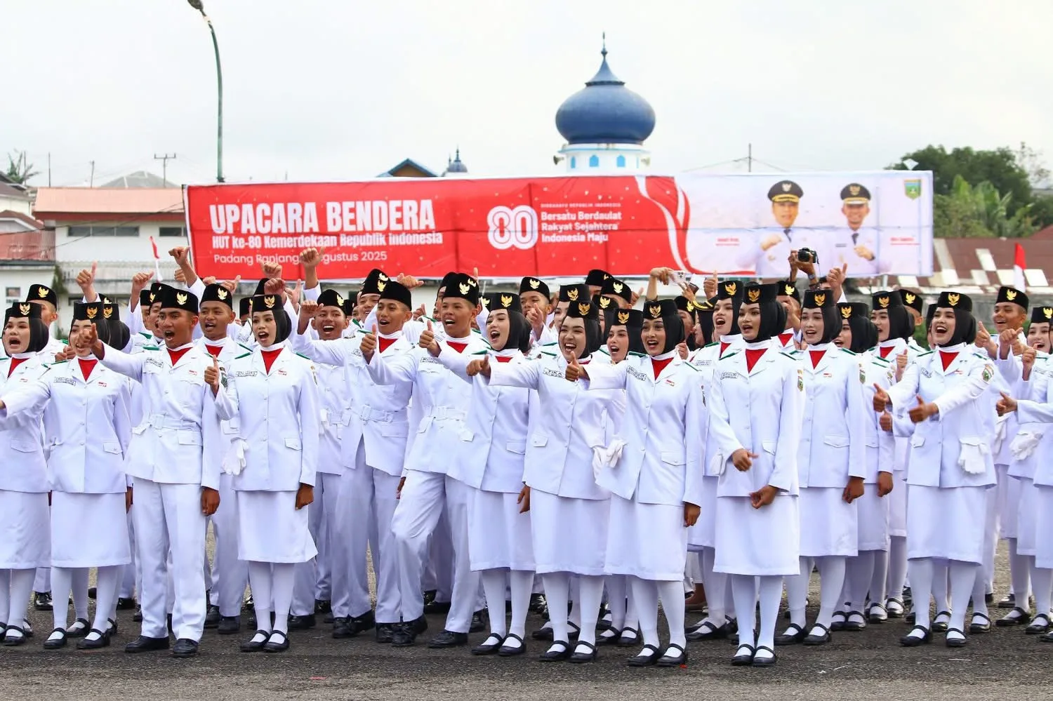 PADANG PANJANG – Pasukan Pengibar Bendera Pusaka (Paskibraka) Kota Padang Panjang berhasil menjalankan tugasnya dengan penuh khidmat dalam prosesi penurunan Bendera Merah Putih pada Upacara Peringatan Hari Ulang Tahun ke-80 Kemerdekaan Republik Indonesia (HUT RI) yang digelar di Lapangan Bancalaweh, Ahad (17/8/2025) sore.Dari 65 anggota Paskibraka yang terpilih, tiga di antaranya mendapat kehormatan untuk melaksanakan tugas utama dalam prosesi penurunan bendera. Mereka adalah Ibnu Rayhan Ramadhan, pengerek bendera dari SMAN 2, Syamil Mohammad Zakwan, pengibar vendera dari SMAN 1 Padang Panjang, dan Belva Putri Kirani, pembawa baki vendera dari SMAN 3.