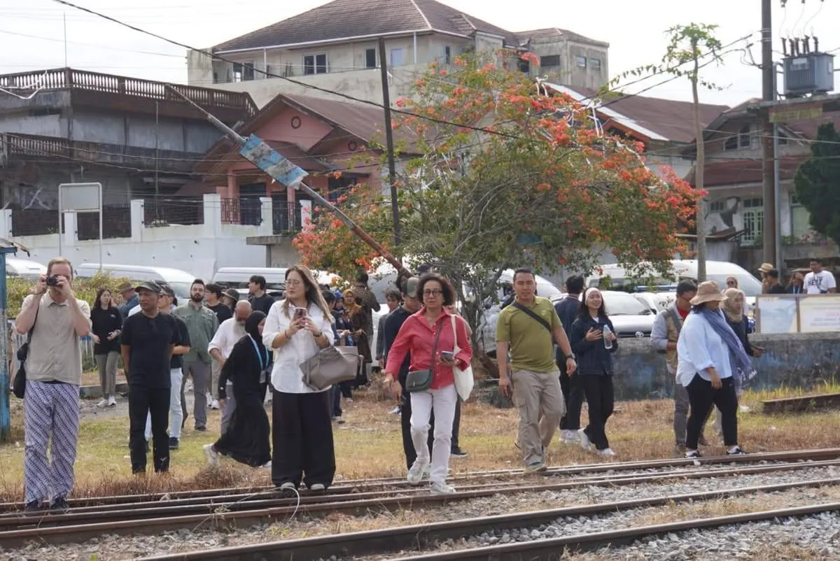 PADANG PANJANG – Sebanyak 45 perwakilan dari 15 negara yang tergabung dalam We Are Site Managers International Symposium lakukan kunjungan ke Stasiun Kereta Api Padang Panjang, Ahad (24/8/2025). Stasiun ini merupakan salah satu bagian dari Warisan Dunia Tambang Batubara Ombilin Sawahlunto (WTBOS).Rombongan disambut Sekretaris Daerah Kota, Sonny Budaya Putra, bersama Asisten II, Ewasoska, Kepala Dinas Pendidikan dan Kebudayaan, Nasrul serta Kepala Dinas Pemuda, Olahraga, dan Pariwisata, Nurasrizal.