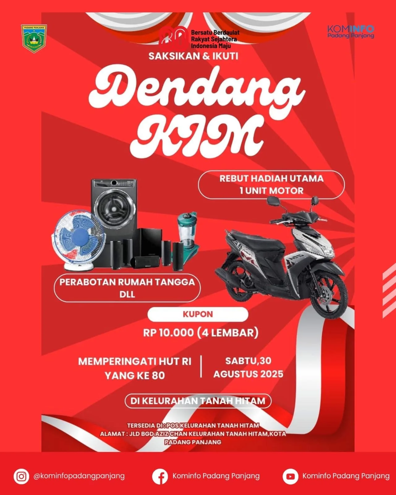PADANG PANJANG – Semangat peringatan Hari Ulang Tahun (HUT) ke-80 Kemerdekaan Republik Indonesia kian terasa di Kota Padang Panjang. Karang Taruna Kelurahan Tanah Hitam bersiap menggelar Dendang KIM pada Sabtu (30/8/2025) malam, sebuah kegiatan hiburan rakyat yang dipadukan dengan semangat kebersamaan.Acara yang terbuka untuk masyarakat luas ini menyiapkan beragam hadiah menarik, mulai dari satu unit sepeda motor sebagai hadiah utama, hingga perabotan rumah tangga dan berbagai hadiah hiburan lainnya.