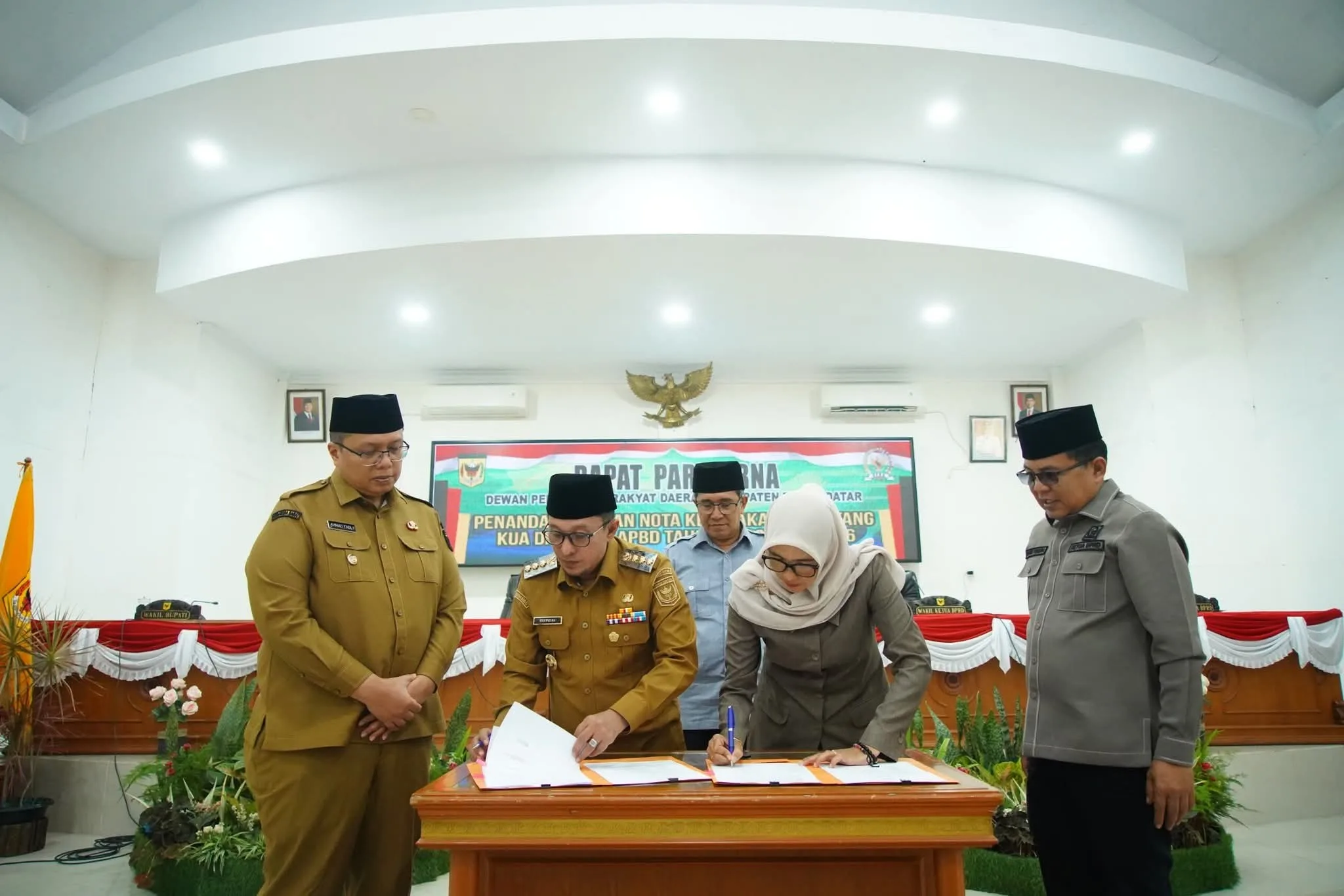 TANAH DATAR, Bacalahnews - DPRD Tanah Datar bersama Pemkab sepakat menandatangani KUA dan PPAS APBD tahun 2026 dalam rapat paripurna dewan, Selasa (2/9/2025).Rapat paripurna dipimpin Ketua DPRD Anton Yondra didampingi Wakil Ketua Nurhamdi Zahari dan Kamrita dihadiri anggota dewan, Bupati Eka Putra, Wabup Ahmad Fadly, Sekwan Yuhardi, Sekda Abdurahman Hadi, pimpinan OPD, camat, dan wali nagari.