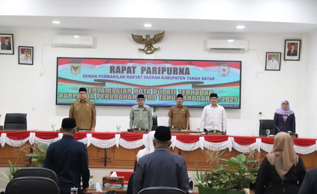 TANAH DATAR, Bacalahnews - DPRD Tanah Datar menggelar Rapat Paripurna penyampaian nota Perubahan APBD 2025 di Ruang Sidang Utama Gedung DPRD, Senin (8/9/2025).Rapat dipimpin Ketua DPRD Anton Yondra didampingi Wakil Ketua Nurhamdi Zahari dan Kamrita, serta dihadiri 24 anggota DPRD, Wabup Ahmad Fadly, Forkopimda, Sekwan Yuhardi, Sekda Abdurahman Hadi, para Asisten, Staf Ahli, pimpinan OPD, Camat, dan Wali Nagari.