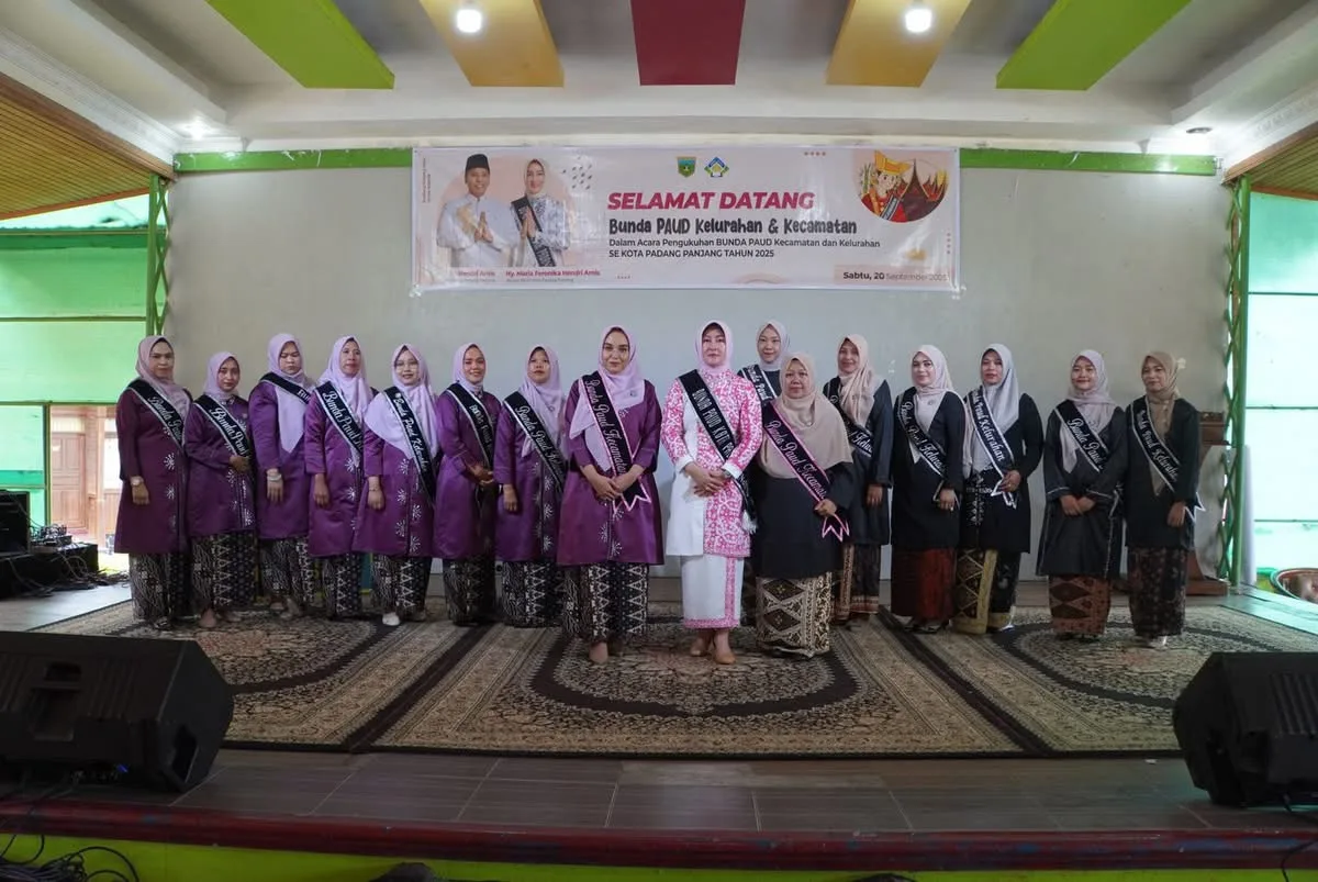 PADANG PANJANG – Bunda PAUD Kota Padang Panjang, Ny. Maria Feronika Hendri resmi dikukuhkan bersamaan dengan pengukuhan Bunda PAUD tingkat kecamatan dan kelurahan.Pengukuhan yang berlangsung di Panggung Satelit Minang Fantasi (Mifan), Sabtu (20/9/2025), turut dihadiri Kepala Dinas Pendidikan dan Kebudayaan Kota Padang Panjang, Nasrul, jajaran Disdikbud, Staf Ahli PKK, Ny Sri Wahyuni Allex, Ketua DWP, Ny Sri Hidayani Sonny, Sekretaris PKK Aisyah, pengurus PKK serta undangan lainnya.