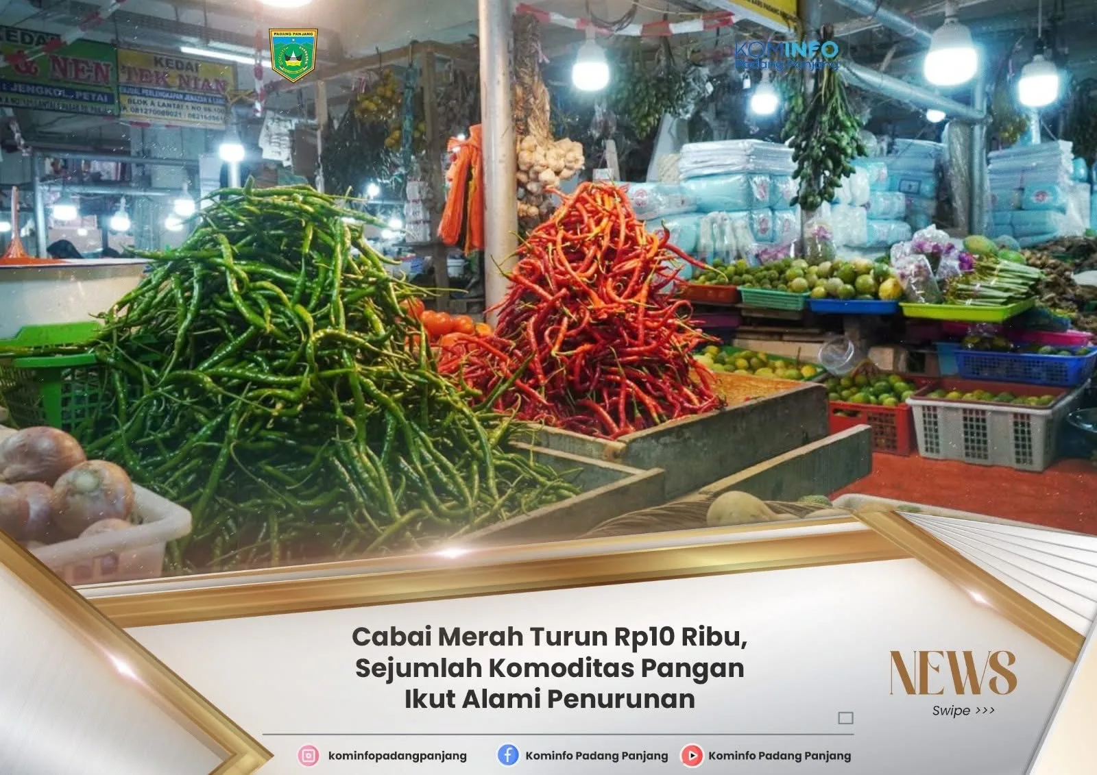 PADANG PANJANG – Harga sejumlah komoditas pangan di Kota Padang Panjang alami penurunan pada Minggu keempat September 2025. Penurunan paling signifikan terjadi pada cabai merah yang turun Rp10.150 dari Rp95.150 menjadi Rp85 ribu/kg.Selain cabai merah, harga cabai hijau juga turun Rp5.666 menjadi Rp61.667/kg. Vawang merah turun Rp5.367 menjadi Rp32.650/kg. Telur itik turun Rp800 menjadi Rp32 ribu/kg. Bawang daun turun Rp700 menjadi Rp9.300/kg. Serta bawang bombai turun Rp400 menjadi Rp33.300/kg.