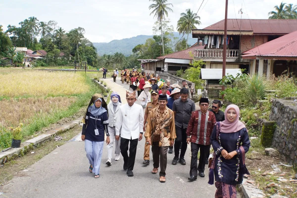 PADANG PANJANG — Kementerian Pariwisata (Kemenpar) melalui Deputi Bidang Pemasaran membawa rombongan konten kreator, media nasional, serta travel agent/tour operator guna mengenal dan mempromosikan potensi wisata yang ada di Desa Kubu Gadang, Selasa (30/9/2025).Kunjungan ke desa yang terletak di Kelurahan Ekor Lubuk, Kecamatan Padang Panjang Timur (PPT) ini diawali dengan penyambutan Tari Pasambahan, lalu rombongan disuguhi kuliner khas berupa Nasi Kabaka, nasi bekal tradisional berbungkus daun.